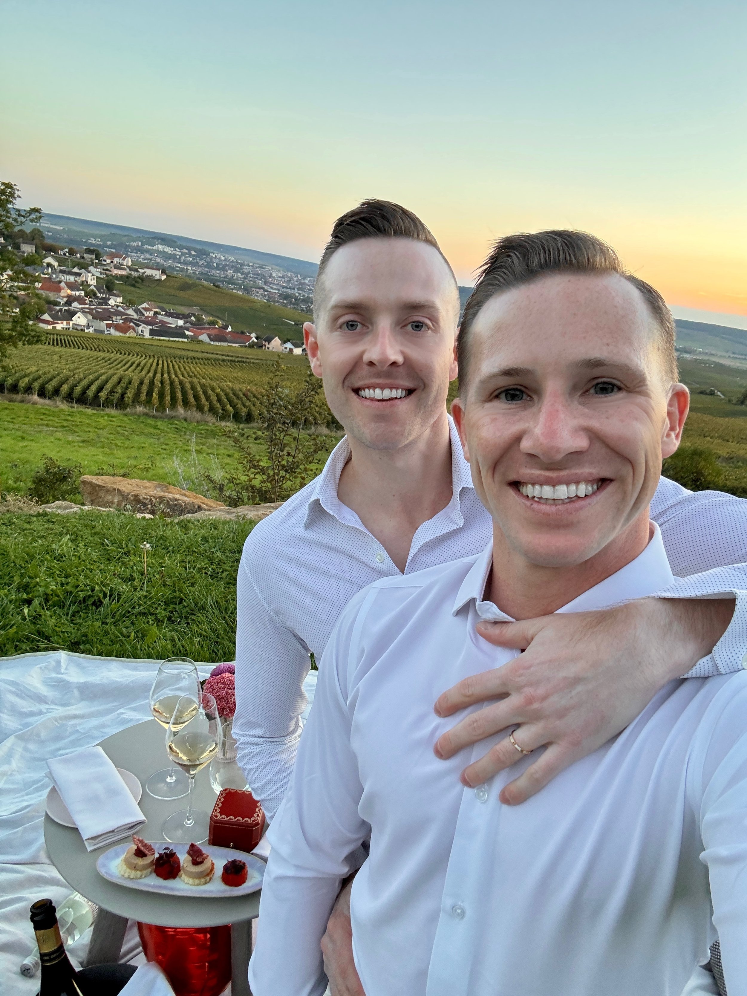 Then came October of 2024. Stephen planned a trip to France, and on a hillside overlooking Épernay in Champagne, France he proposed. Aidan said yes through happy tears. Days later in Paris, Stephen surprised him again by secretly arranging for both sets of parents to join the celebration. It was one of those surreal, overwhelmingly joyful moments neither of us will ever forget.